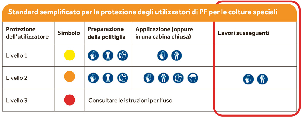 Per i prodotti per i quali, nonostante l‘uso di abiti da lavoro e guanti, non è possibile eseguire i lavori susseguenti in modo sicuro il giorno dopo i trattamenti, sono stati stabiliti dei tempi di rientro. Durante questo periodo, è assolutamente proibito eseguire i lavori di potatura verde (anche indossando i DPI). Prima di entrare nuovamente nella particella trattata in sicurezza, con abiti da lavoro e guanti, si deve aspettare che i residui sulle foglie si siano sufficientemente decomposti. Soltanto per i prodotti di livello 3 (rosso), secondo lo standard semplificato per la protezione degli utilizzatori di PF, sono prescritti dei tempi di rientro.